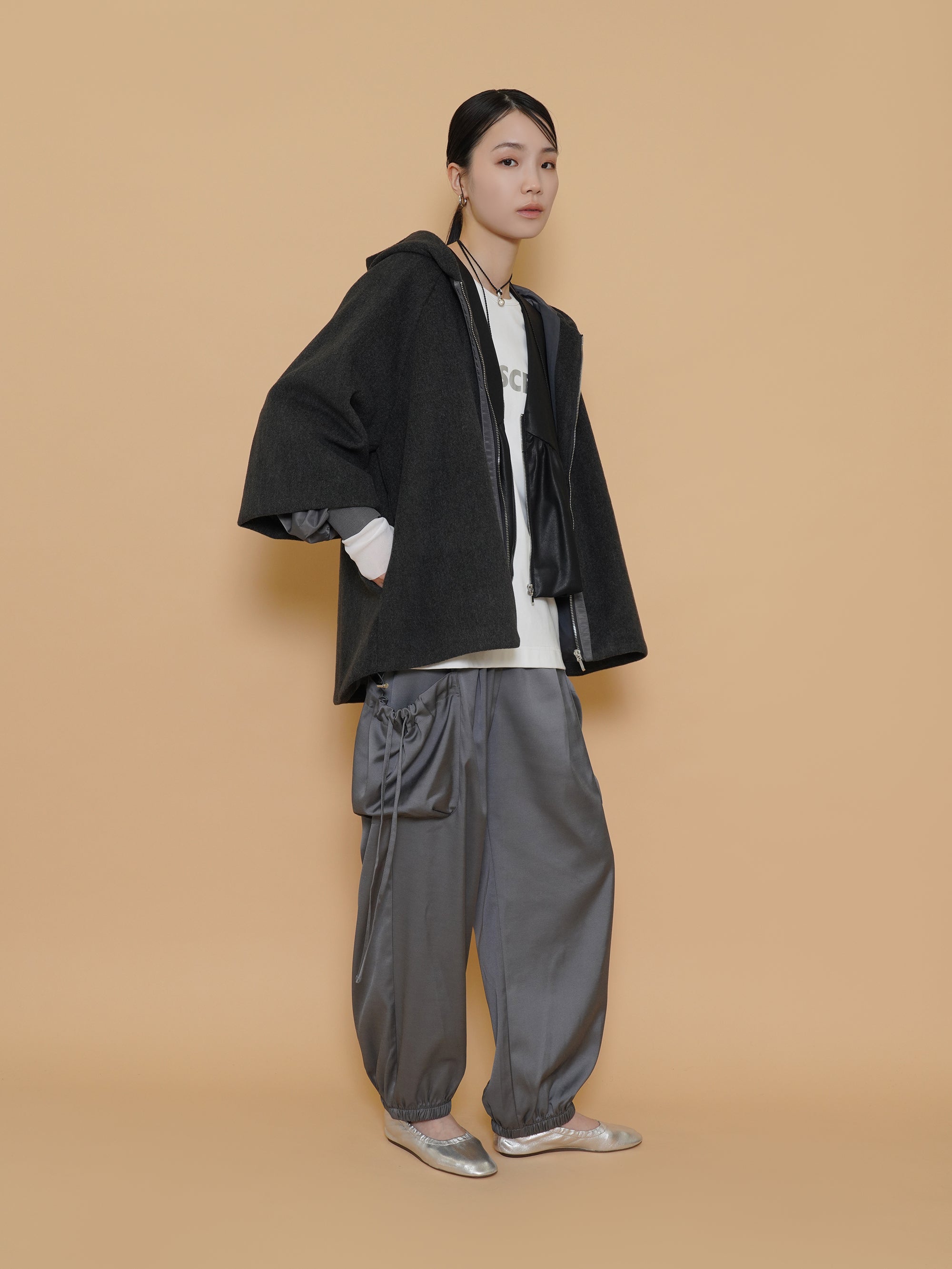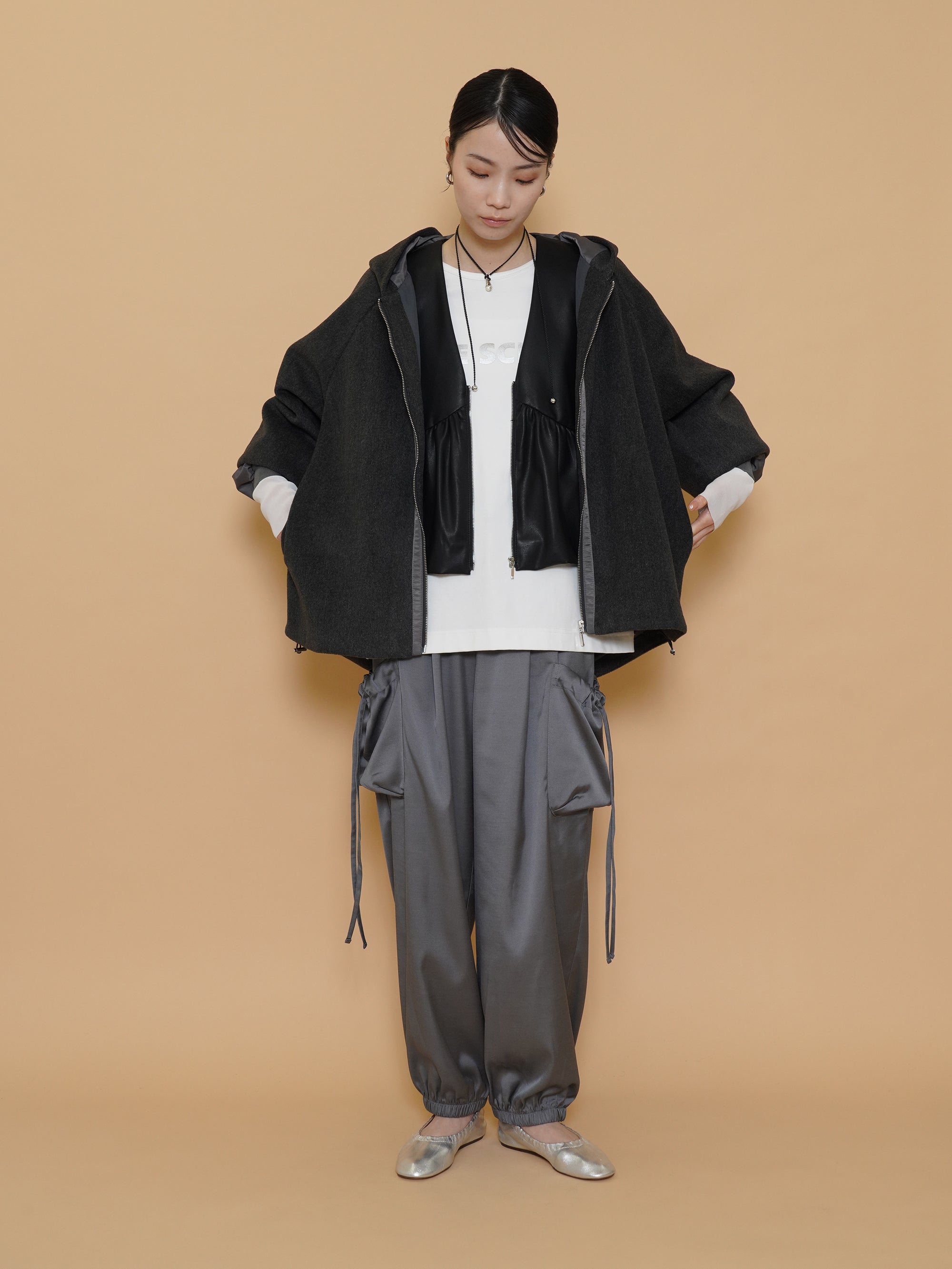 ギャザーバルーンシルエットがレザーのハードさに可愛らしさを